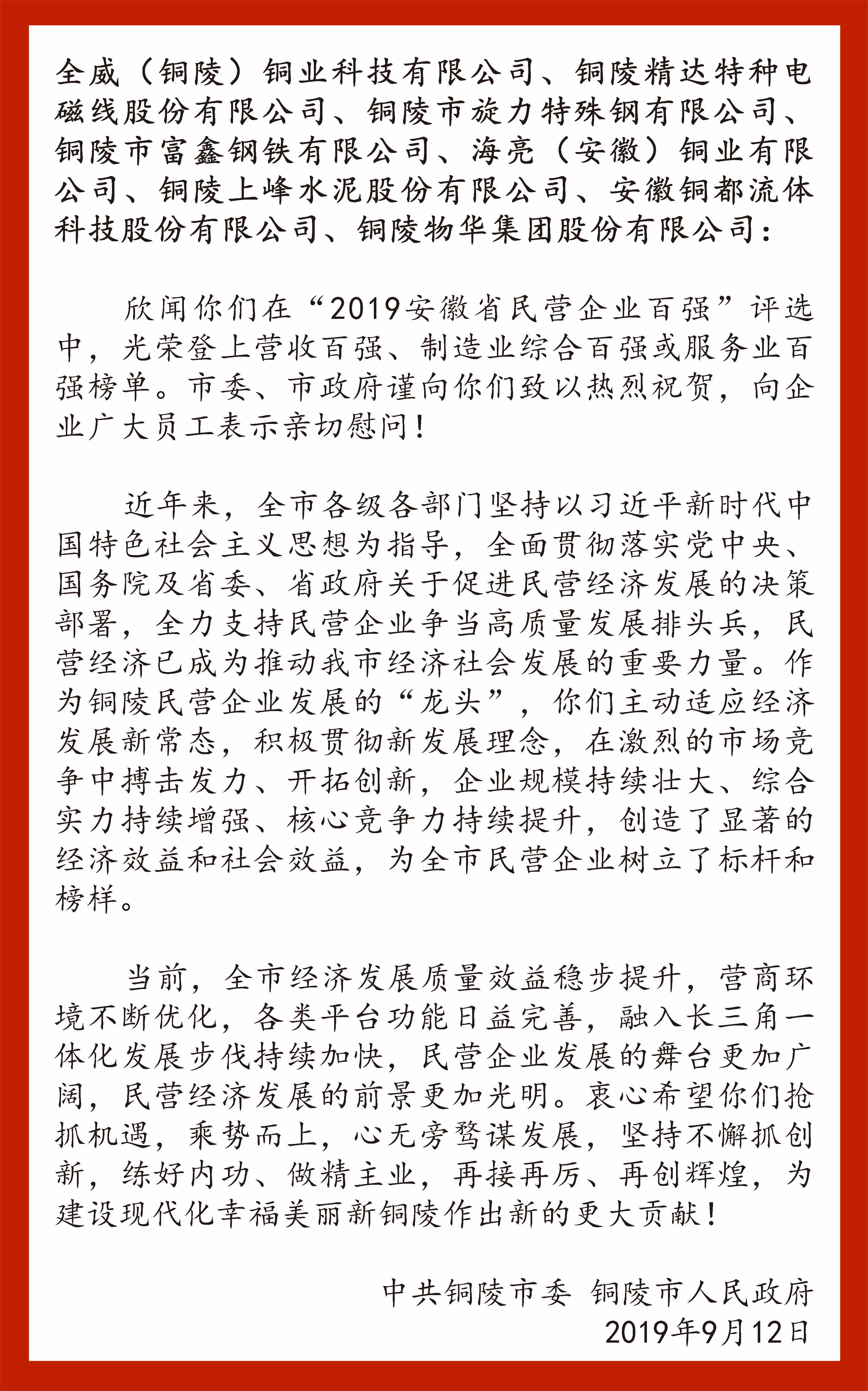 9月12日,在中秋佳節(jié)即將來臨之際,中共銅陵市委、銅陵市政府對銅都流體榮登“2019安徽省民營企業(yè)百強(qiáng)”榜單致以熱烈祝賀,對企業(yè)員工表示親切慰問!